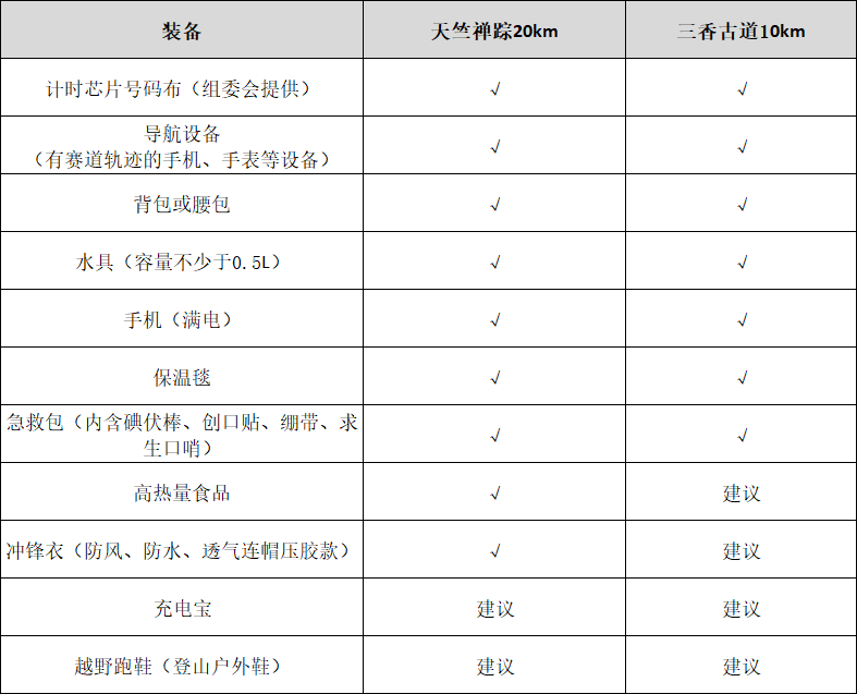 参与者需在活动中全程携带所有强制装备,具体如下表:
