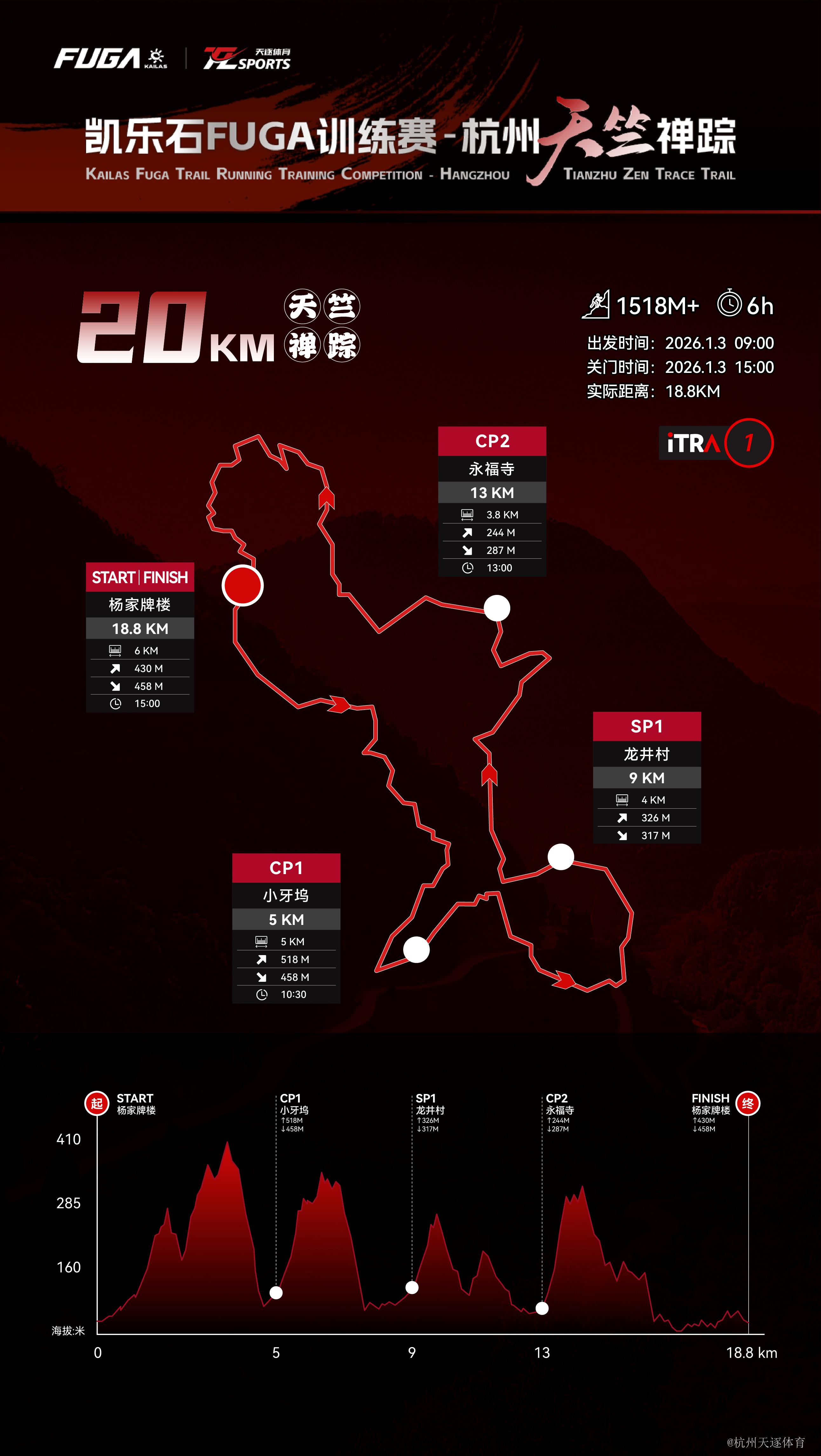 路线说明:起点杨家牌楼-永兴寺-石人亭-天竺山(又称天门山,最高海拔412.5m)-CP1小牙坞(5KM)-十里锒珰-寿星头-九溪十八涧-SP1龙井村(9KM)-梵音亭-天外第一桥-法喜寺-佛学院-CP2永福寺(13KM)-龙门亭-金鱼井-西溪谷-终点杨家牌楼(18.8KM)