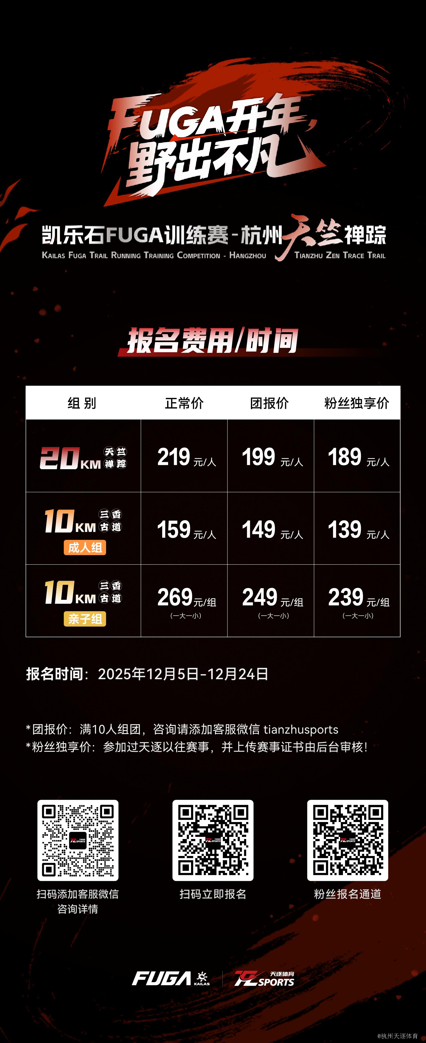 •为感谢大家对天逐的支持,本次赛事推出粉丝独享价,凡参加过天逐以往赛事,报名时附件上传天逐赛事证书,由后台审核通过方可报名成功。请不要随意填写哦!