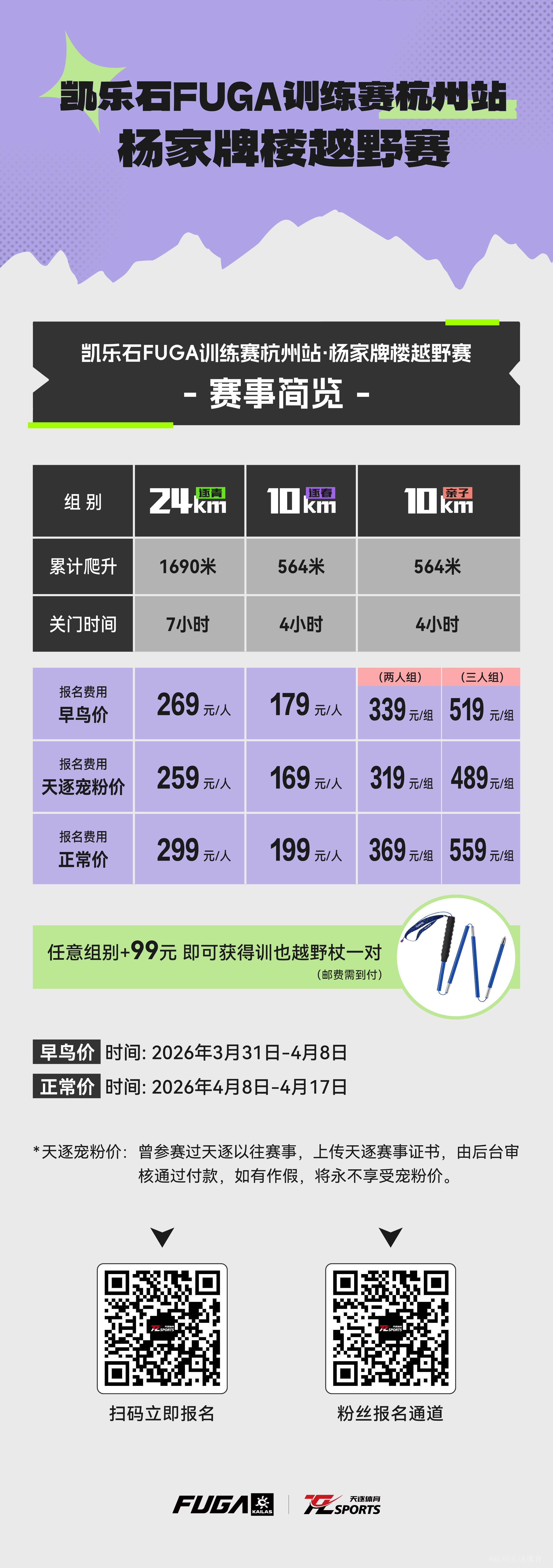 2、报名任意组别 + 99 元,即可升级赛事福利套餐,含专业训练越野杖一对。4 月 17 日报名结束后统一统计邮寄,运费到付。请大家在报名时务必填写选择适合自己的越野杖尺寸。
